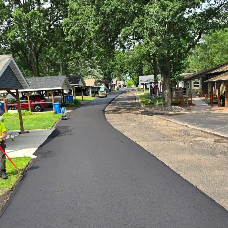 Erickson Asphalt recently completed a comprehensive repaving project for Pine Village, a manufactured home community in Cambridge, MN. This large-scale project involved repaving 150 driveways and over 30,000 square yards of streets, requiring the placement of 5,025 tons of asphalt. The project was crucial for improving the community's infrastructure ensuring safer and more reliable roads for its residents.